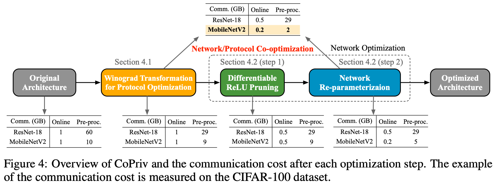 在该研究中,我们强调隐私推理的预处理和在线阶段的开销同等重要,并提出CoPriv协同优化神经网络架构和隐私推理协议。首先,CoPriv基于Winograd算法优化常用的3x3卷积,并提出了一系列优化方案。对于轻量级移动网络,如MobileNetV2,我们提出可微分ReLU剪枝和网络重参数化技术。相比于现有的研究,我们的工作同时优化了线性层(卷积)和非线性层(ReLU和截断),以同时提高预处理和在线阶段的通信效率。下图展示了完整的协同优化框架,并以ResNet-18和MobileNetV2为例直观展示了各个优化所带来的收益。