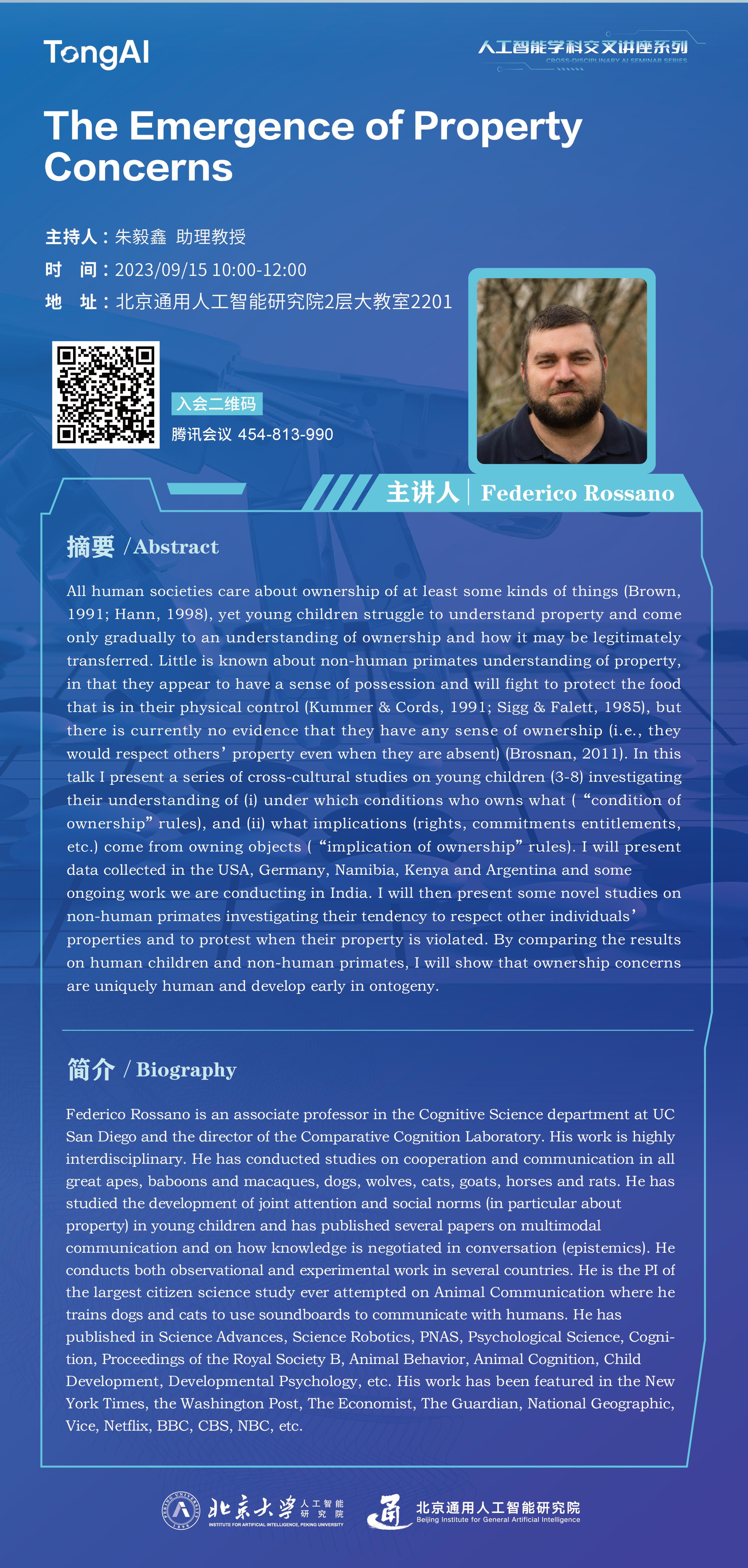 All human societies care about ownership of at least some kinds of things (Brown, 1991; Hann, 1998), yet young children struggle to understand property and come only gradually to an understanding of ownership and how it may be legitimately transferred. Little is known about non-human primates understanding of property, in that they appear to have a sense of possession and will fight to protect the food that is in their physical control (Kummer & Cords, 1991; Sigg & Falett, 1985), but there is currently no evidence that they have any sense of ownership (i.e., they would respect others’ property even when they are absent) (Brosnan, 2011). In this talk I present a series of cross-cultural studies on young children (3-8) investigating their understanding of (i) under which conditions who owns what (“condition of ownership” rules), and (ii) what implications (rights, commitments entitlements, etc.) come from owning objects (“implication of ownership” rules). I will present data collected in the USA, Germany, Namibia, Kenya and Argentina and some ongoing work we are conducting in India. I will then present some novel studies on non-human primates investigating their tendency to respect other individuals’ properties and to protest when their property is violated. By comparing the results on human children and non-human primates, I will show that ownership concerns are uniquely human and develop early in ontogeny.