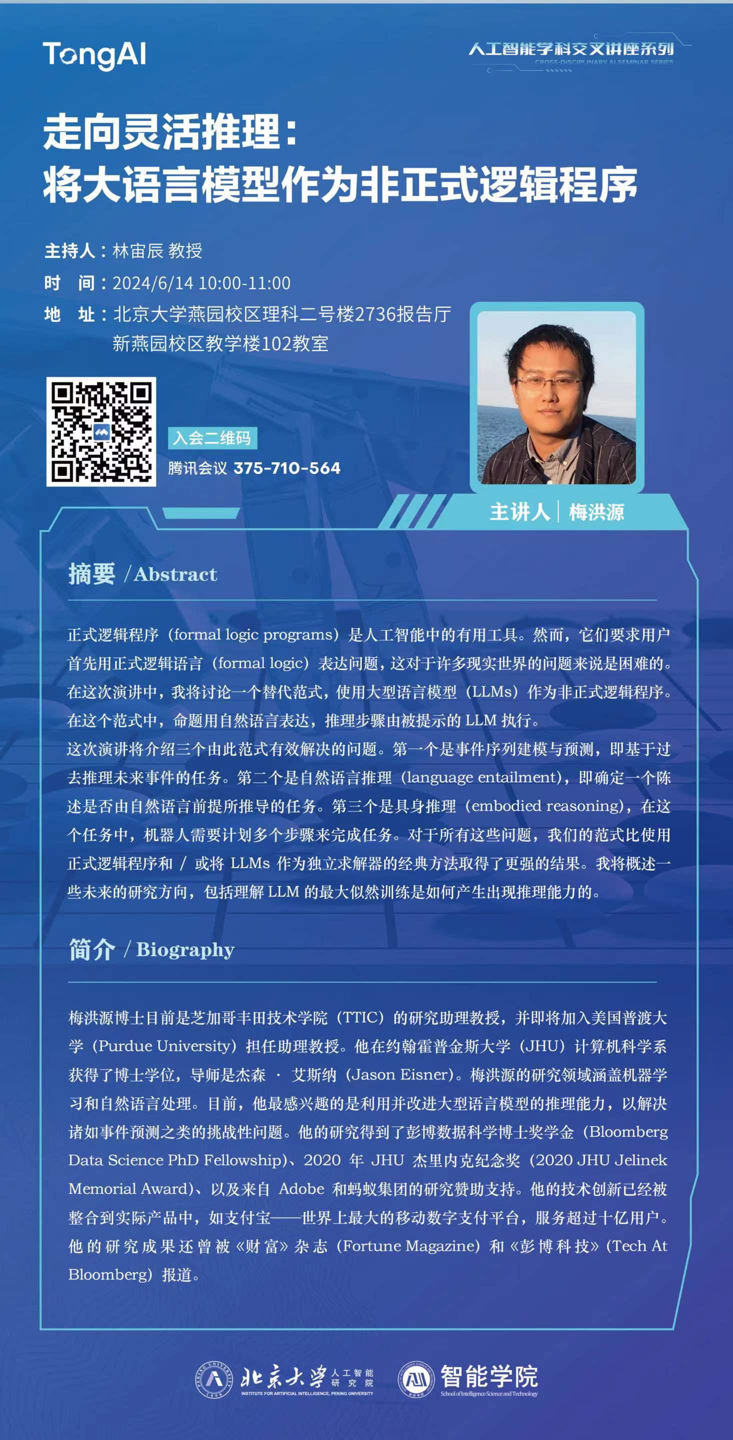 正式逻辑程序(formal logic programs)是人工智能中的有用工具。然而,它们要求用户首先用正式逻辑语言(formal logic)表达问题,这对于许多现实世界的问题来说是困难的。在这次演讲中,我将讨论一个替代范式,使用大型语言模型(LLMs)作为非正式逻辑程序。在这个范式中,命题用自然语言表达,推理步骤由被提示的LLM执行。