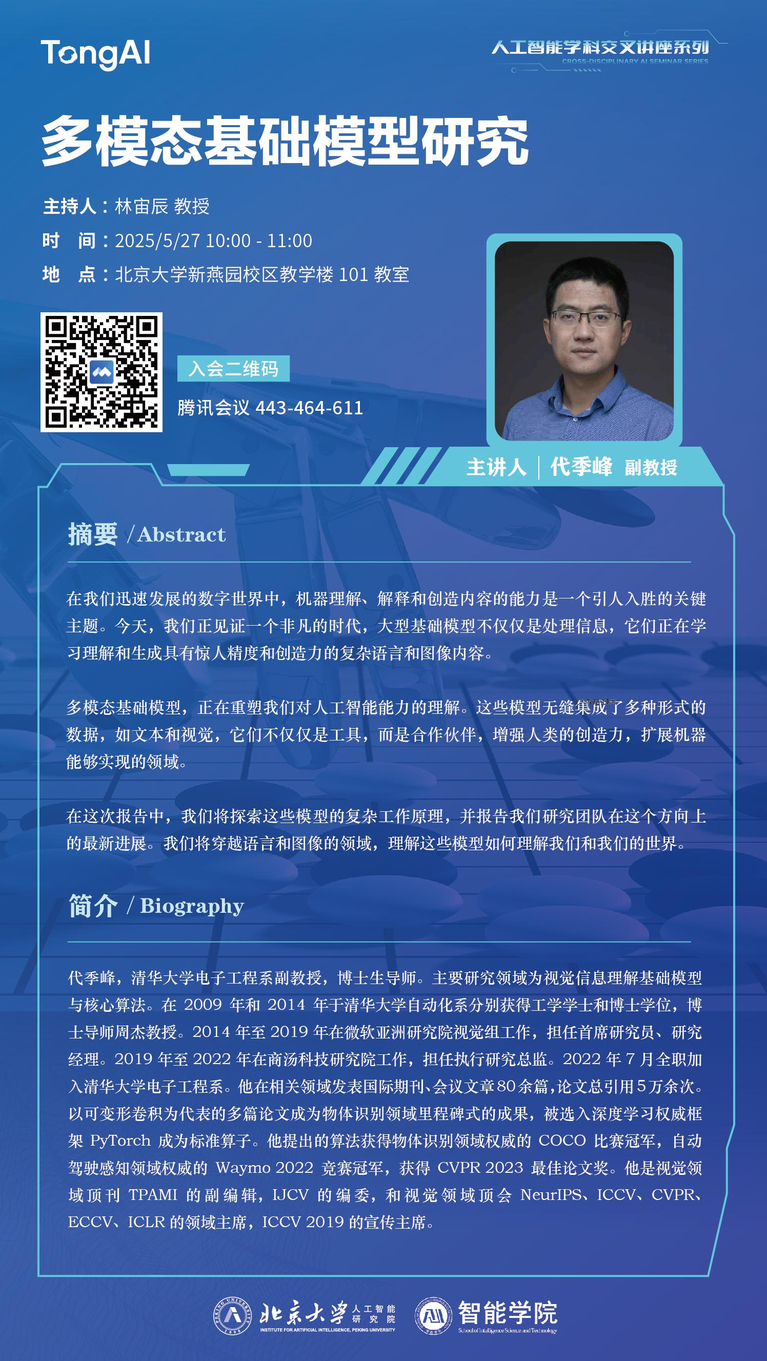 代季峰,清华大学电子工程系副教授,博士生导师。主要研究领域为视觉信息理解基础模型与核心算法。在2009年和2014年于清华大学自动化系分别获得工学学士和博士学位,博士导师周杰教授。2014年至2019年在微软亚洲研究院视觉组工作,担任首席研究员、研究经理。2019年至2022年在商汤科技研究院工作,担任执行研究总监。2022年7月全职加入清华大学电子工程系。他在相关领域发表国际期刊、会议文章80余篇,论文总引用5万余次。以可变形卷积为代表的多篇论文成为物体识别领域里程碑式的成果,被选入深度学习权威框架PyTorch成为标准算子。他提出的算法获得物体识别领域权威的COCO比赛冠军,自动驾驶感知领域权威的Waymo 2022竞赛冠军,获得CVPR 2023最佳论文奖。他是视觉领域顶刊TPAMI的副编辑,IJCV的编委,和视觉领域顶会NeurIPS、ICCV、CVPR、ECCV、ICLR的领域主席,ICCV 2019的宣传主席。