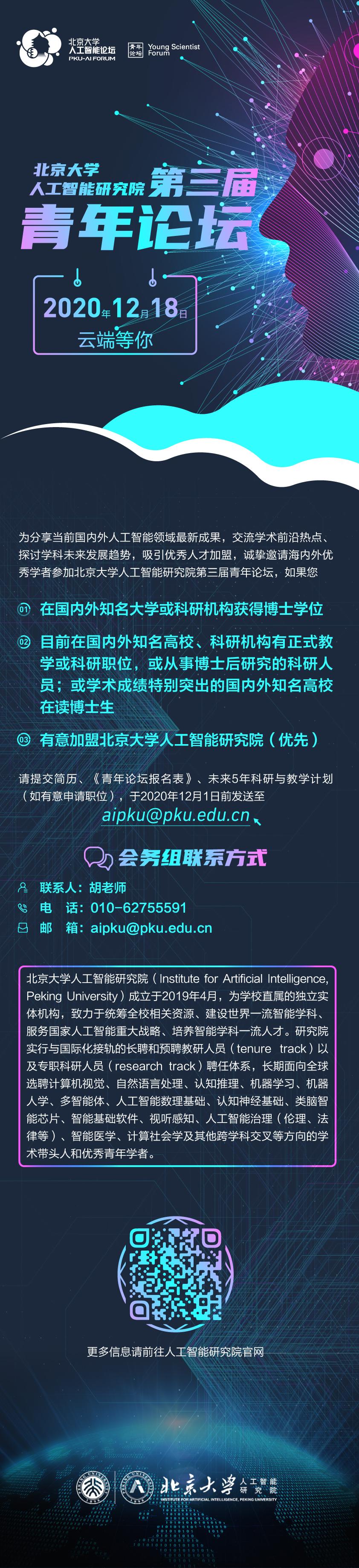 为分享当前国内外人工智能领域最新成果,交流学术前沿热点、探讨学科未来发展趋势,吸引优秀人才加盟,北京大学人工智能研究院拟定于2020年12月18日在线举办第三届青年论坛。诚邀海内外优秀学者参加。
