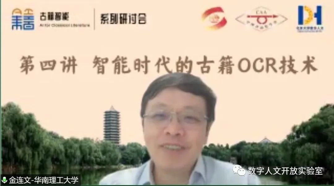金连文教授的报告主题为“古籍OCR:数据、方法及应用”,首先介绍了古籍OCR的研究意义和价值、困难与挑战,然后从数据、算法及应用三个方面分享了自己对于古籍OCR的思考。