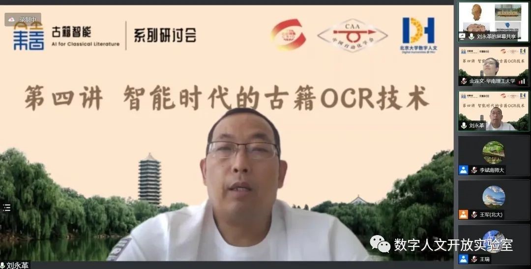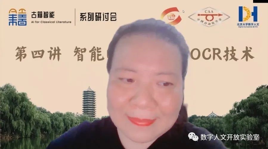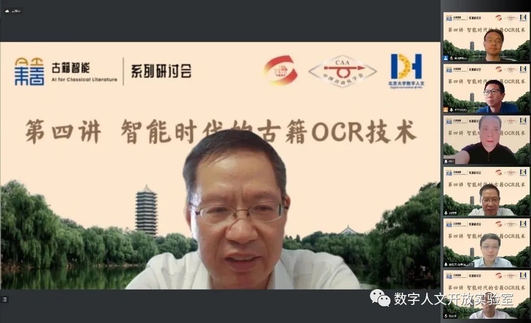 2022年5月21日下午,“古籍智能信息处理”系列专题研讨会第四讲在腾讯会议举行。此次研讨会由北京大学数字人文研究中心、中国图象图形学学会、中国自动化学会主办,北京大学-字节跳动数字人文开放实验室、北京大学人工智能研究院承办,华南理工大学电子与信息学院金连文教授、北京大学数字人文研究中心主任王军教授主持了研讨会。本期研讨会的主题为“智能时代的古籍OCR技术”,中国科学院自动化研究所刘成林教授、华南理工大学金连文教授、安阳师范学院刘永革教授、北京书同文公司张弛宜总经理先后作了精彩的报告,随后由金连文教授主持讨论和互动环节。本次研讨会通过腾讯会议、Bilibili网站、抖音和蔻享平台同步直播,吸引了来自国内外高校及相关研究领域的近4000位观众在线观看。