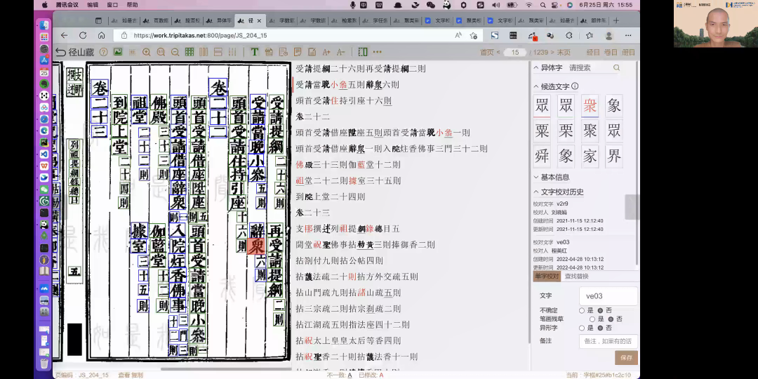 释贤度法师首先介绍了各国佛教大藏经数字化的发展历程,包括CBETA、SAT和高丽藏等大藏经全文数字化成果、CBETA整理的经录数据库以及在CBETA全文数据基础上构建的专题知识库,如“成唯识论”“瑜伽师地论”等专题知识库。并以CBETA为例,介绍了佛教大藏经数字化资源库的功能及特色,包括数据内容、软件功能、专题知识库三个方面。接下来以自身所在的如是研究院为例,介绍了利用人工智能等技术在藏经数字化方面所做的一些工作,包括“《径山藏》数字化”的阶段性成果(全文文本、字图数据库等)、如是古籍数字化工具平台、古籍字典等。报告末尾提出,大藏经数字化的未来发展应当做好两方面的工作:一是作为基础的工作,即准确的文本;二是作为提升的工作,即丰富的应用。