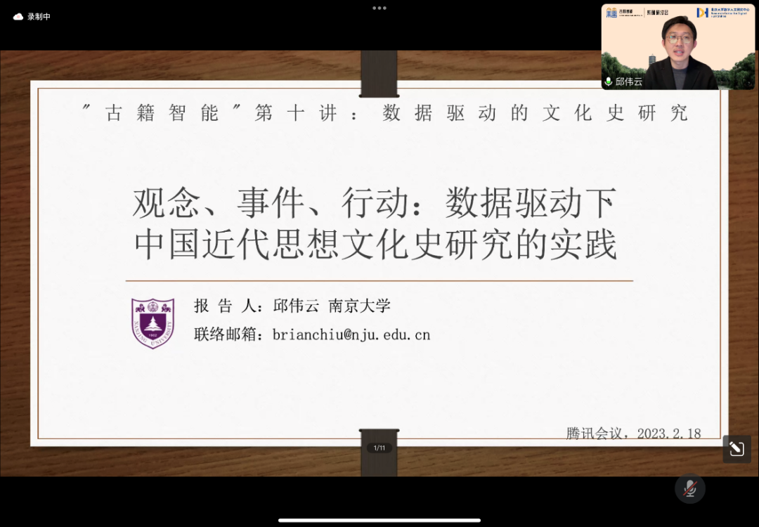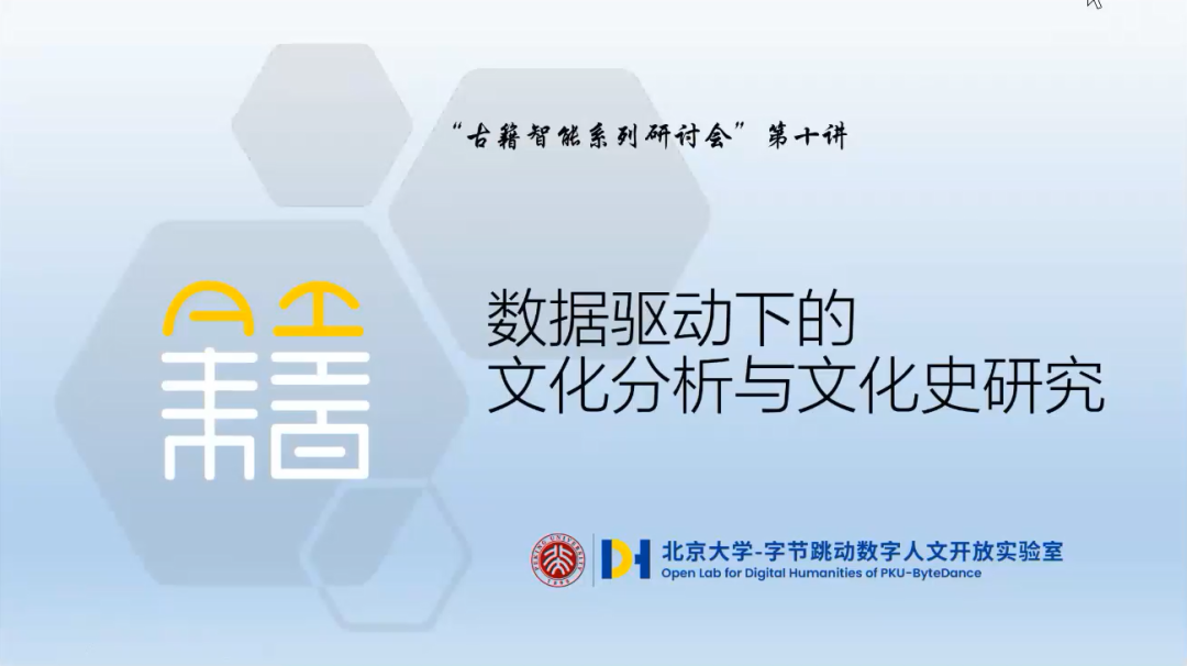 2023年2月18日下午两点,由北京大学数字人文研究中心、北京大学人工智能研究院主办的“古籍智能信息处理”系列专题研讨会第十讲在腾讯会议如期举行。本次讲座由北京大学数字人文研究中心、中国古籍保护协会古籍智能开发与利用专委会主办,北京大学中国古文献研究中心、南京师范大学文学院联合主办,北京大学-字节跳动数字人文开放实验室、北京大学人工智能研究院承办,会议由北京大学王军老师和南京大学刘超老师主持。