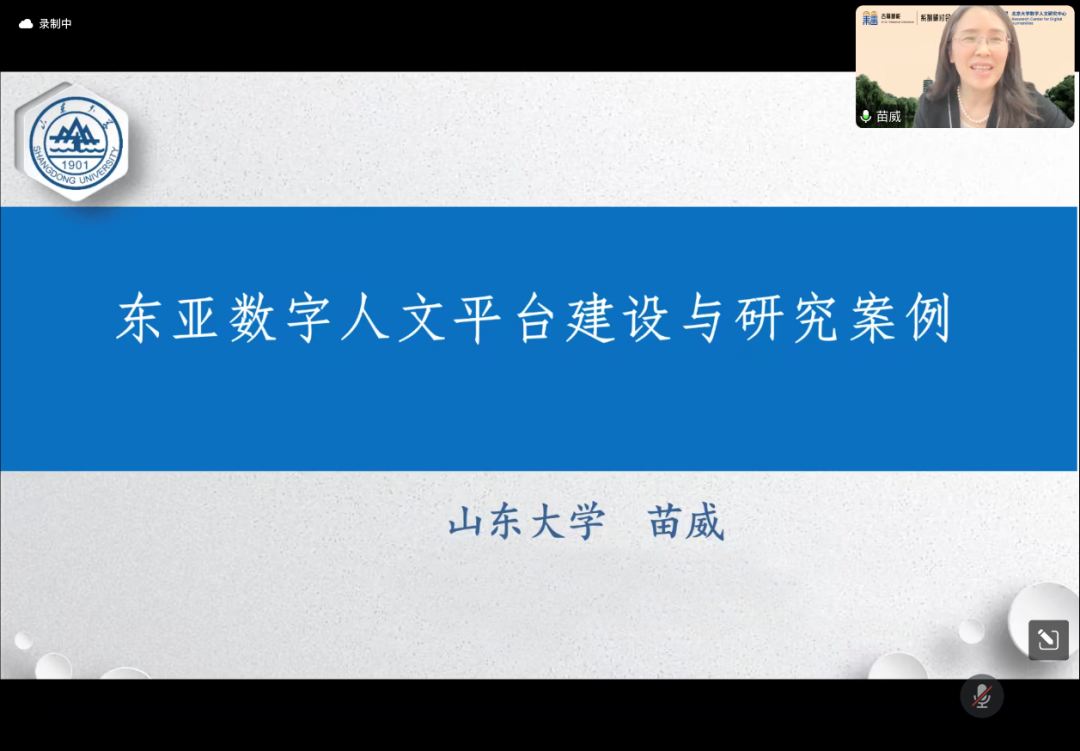 苗威老师从东亚区域的角度介绍了东亚数字人文团队的探索。苗老师首先介绍了东亚数字人文平台建设的主旨与框架,她表示,东亚数字人文的初衷是因为史学领域冷门“绝学”的空间越来越大和东亚数字人文领域缺少具有国际影响力的项目。传统人文学科研究遭遇瓶颈、东亚历史与文化“问题化”、历史书写艰深与和互联网发表便捷的共存是目前东亚人文书写的表征。东亚数字人文工作主要是基于现实需求和基于实践的问题解决。东亚数字人文团队以传统人文学科为基础,以东亚区域为凝聚,做到传统和现代的有机凝合和文理工学科协同攻关。随后苗老师以专题文献实体关系抽取与标注、适应性预训练和汉籍使者行程命名实体识别和东亚古籍中印章的提取为例介绍了其团队数字人文的技术实践。表示东亚数字人文实践通过使用地理信息系统和天文系统实现了“天地人合一”。随后,苗老师介绍了东亚数字人文综合门户建设的基本情况,并介绍了相关功能。最后,苗老师希望通过东亚数字人文研究,天、地、人、文等诸多元素相互配合,更大程度地去主观化,让客观化的内容更加清晰地呈现,让历史学真正成为科学,并欢迎学界同仁前来探讨。