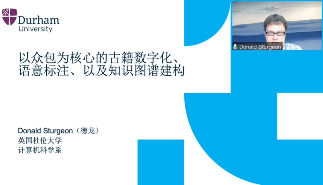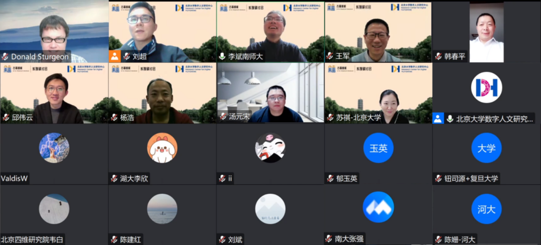 此次讲座主题为“数据驱动的文化史研究”,南京大学邱伟云老师、山东大学苗威老师、英国杜伦大学Donald Sturgeon老师、北京大学苏祺老师和杨浩老师先后发表了精彩的报告,本次研讨会通过腾讯会议、哔哩哔哩平台、抖音同步直播,来自国内外高校及相关研究领域的千余位学者一同观看,共襄盛会。