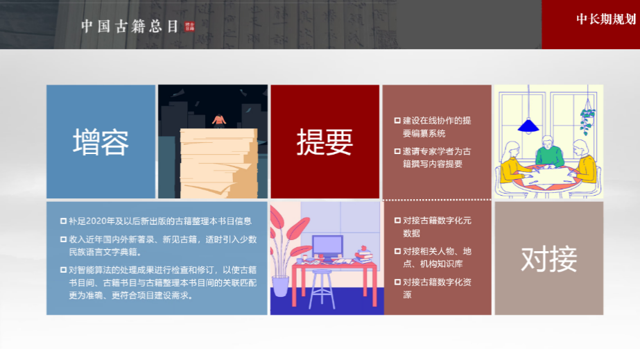 苏瑞欣老师介绍了古联(北京)数字传媒科技有限公司开发的三款古籍书目产品:中华古籍书目数据库、历代石刻总目数据库、中国古籍总目(网络版),及支撑工具古籍书目智能处理系统。中华古籍书目数据库是对历代书目文献的综合利用,“籍合”自古至今各类已整理的书目资源,将准确、权威的书目作碎片化数据处理,实现一站式检索;唐五代墓志专目综合整理石刻资源在各类文献中的著录情况,对墓志的题名、主题词、时间、地点细致标注,通过考证、标注墓志志主之间的人物关系实现库内资源关联,还支持跨库调阅墓志原始文献;中国古籍总目(网络版)则是《中国古籍总目》在新的网络时代所进行的新布局,古籍书目智能处理系统是进行各类书目相关数据库和项目建设的支撑工具。苏瑞欣老师详细描述这些系统的策划、当前进展和后续规划,期待通过书目库建设引入更多关联资源,逐步搭建更加全面、系统的中国古籍知识网络工程体系。