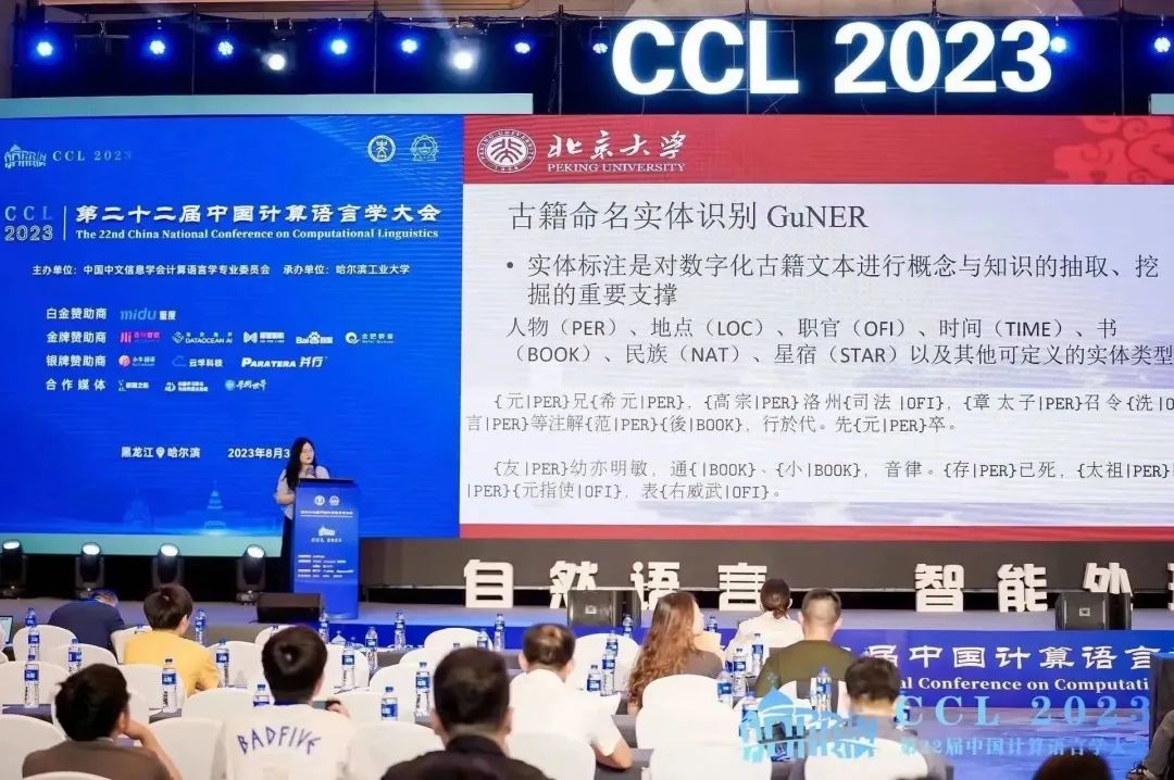 2023年8月4-5日,由中国中文信息学会主办、哈尔滨工业大学承办的第22届中国计算语言学大会(CCL 2023)在哈尔滨举办。在8月4日下午的评测研讨会上,古籍命名实体识别评测任务(GuNER 2023)作为第一个评测任务,首先进行评测总结报告和参赛队伍分享报告。在总结报告中,评测组织方首先介绍了古籍命名实体识别任务的定义,总结了数据资源和算法技术上的难点,然后介绍本次评测在实体知识体系、时间和领域跨度、多赛道设置等方面的特色,随后介绍了评测的参赛情况和获奖结果,最后对参赛系统的模型结构、预训练方法、数据增强方法等进行了总结和范式分析。获得一至三等奖的前4支队伍随后在评测研讨会上报告了各自参赛系统的方法和实验结果,报告名分别为:基于信息论约束及篇章信息的古籍命名实体识别、基于增量预训练与对抗学习的古籍命名实体识别、基于持续预训练方法与上下文增强策略的古籍命名实体识别、基于 BERT-Global Pointer 的古籍命名实体识别方法。各位报告人与现场参会人员进行了充分讨论,促进了学界对古籍命名实体识别任务和本次评测的深入了解。