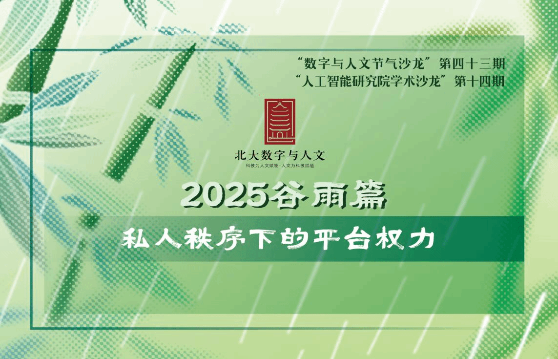 2025年4月21日中午,北京大学“数字与人文节气沙龙”系列活动第四十三期暨人工智能研究院学术沙龙第十四期在百周年纪念讲堂四季庭院举行。本期沙龙以“私人秩序下的平台权力”为主题,以私营企业的平台权力现象为核心,深入探讨其背后的社会变化逻辑,进一步分析其所带来的社会秩序结果,尝试在理论建构层面展开更多对话。活动由北京大学社会科学部与人工智能研究院联合主办,吸引了法学院、政府管理学院、经济学院、心理与认知科学学院、社会学系等多个院系的专家学者参与。