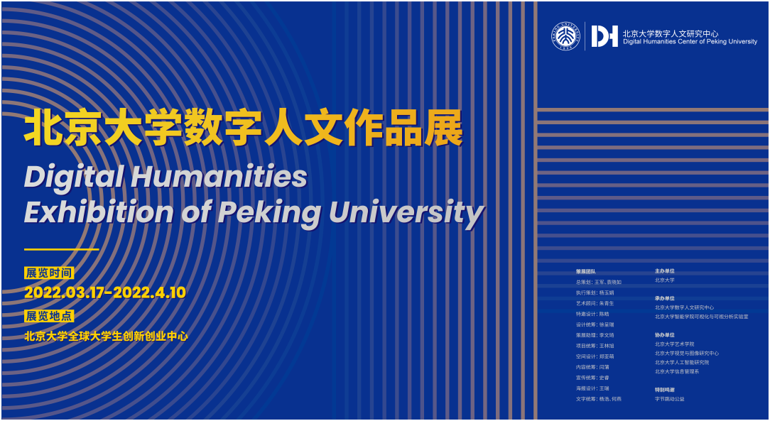 作为北京大学2022年“数字与人文”年的首秀活动,由北京大学主办,北京大学数字人文研究中心与智能学院可视化实验室、艺术学院、视觉与图像研究中心、人工智能研究院、信息管理系等机构共同承办的首届“北京大学数字人文作品展”将于2022年3月17日至4月10日在北京大学全球大学生创新创业中心(二教西北角)向全校师生开放。